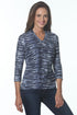 This sophisticated three-quarter sleeve top features an elegant wave motif across white, navy, and blue colorways. The understated V-neckline adds refined dimension to an effortlessly versatile silhouette. A thoughtfully designed piece that transitions seamlessly through seasonal wardrobes, offering both visual interest and timeless appeal.