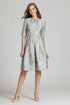 This Teri Jon jacquard dress features a flattering A-line silhouette with elegant 3/4 sleeves, crafted from platinum jacquard fabric with intricate metallic detailing. Its sophisticated design and neutral tones make it an excellent choice for daytime weddings throughout the year, combining style and versatility with affordability.