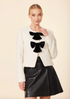 This chic tweed jacket combines timeless style with a playful twist. Designed with a round neckline, long sleeves, and front snaps, it’s finished with two statement black velvet bows for a feminine touch. Crafted from a cozy wool blend and fully lined for comfort.