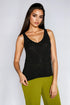 This Joseph Ribkoff Metallic Camisole in black features a ribbed metallic knit that delivers a subtle, elegant shimmer. Its deep V-neckline at both front and back creates a flattering silhouette, while rhinestone-inspired iron-on detailing adds a refined, luxurious touch perfect for sophisticated evening occasions.