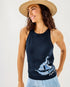 Lilly Pulitzer's Low Tide Navy Après Sail Jacquard Tank features a sleek navy knit design with a light blue sailboat graphic. This sleeveless crew neck top offers a flattering silhouette that pairs perfectly with the coordinating light blue shorts for a complete nautical-inspired look. Ideal for summer outings, beach days, or casual resort wear, this versatile piece embodies Lilly's signature coastal aesthetic with its maritime motif and comfortable fit.
