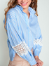 Airy and feminine, this light blue striped shirt with soft brown accents is set against a fresh white base. The ruffled stand-up collar and long voluminous sleeves finished with delicate white lace trim add a romantic touch. Crafted from 100% cotton with a front button closure for a timeless, easy-to-wear look.