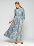 Flowing and full of color, this long blue dress is alive with a multicolor cheetah and tropical foliage print in fresh green, soft lavender, and coral tones. A gently raised neckline ties in back above a chic keyhole opening, while a gathered waist flatters your shape. Three-quarter puff sleeves with gathered cuffs add a touch of volume, and the airy fabric drapes beautifully for an effortless, resort-ready look.