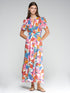 This long dress features a vibrant tropical flower print in blue, pink, and orange. The V neckline adds a touch of elegance, while the elastic waist ensures a comfortable fit. Made from 100% cotton, with short puffed sleeves.