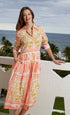 Introducing our Tea Length Button Front Dress in a Scroll Print! This dress offers a comfortable and flattering fit perfect for your resort and everyday occasions.
